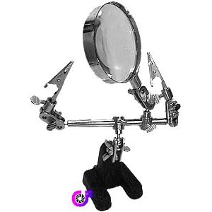 Perfect for soldering, the helping hands can hold small components, PC boards, or anything that requires soldering or fine assembly. Includes magnifier. Will adjust to any angle. Net weight: 1-1/4 lbs. Dimensions: 5" x 5".